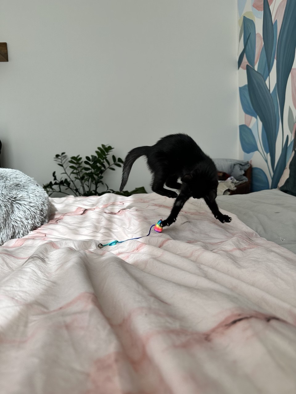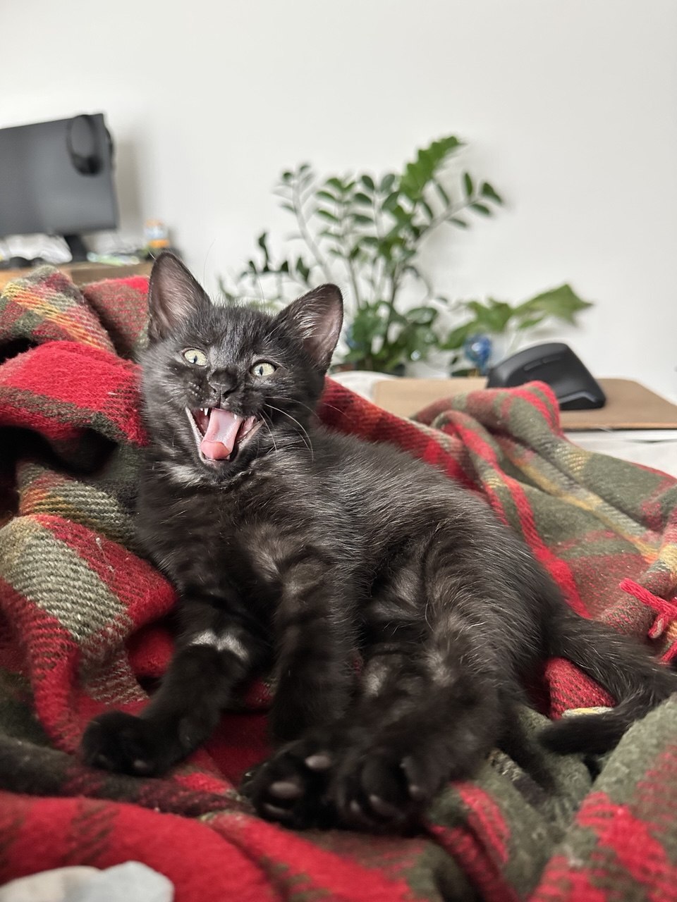 She’s around 8-9 weeks old and will be available for adoption in a month.